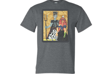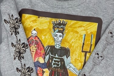 Aidan loves to draw mythical and fantastical images. Realizing his drawings would make a wonderful shirt design, we set out together to create this masterpiece