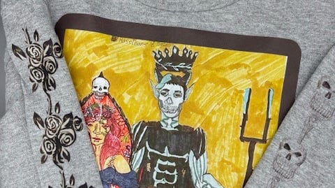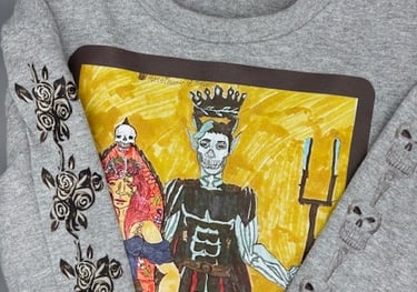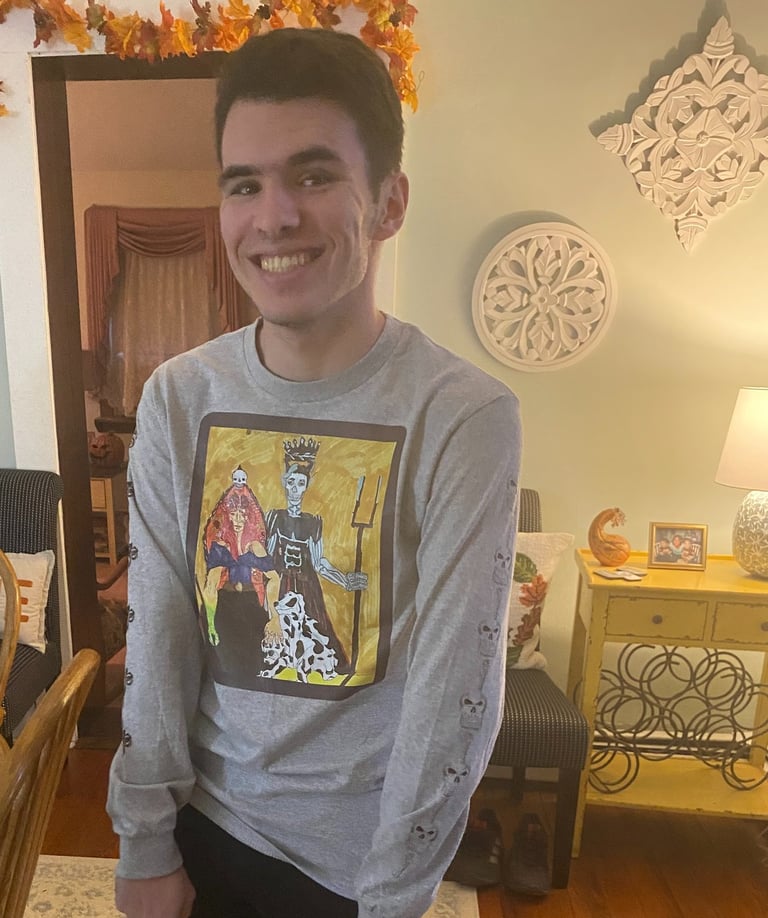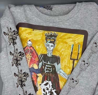 With his sketches of skulls down one sleeve, roses down the other, and his unique artwork on the front, it came out even better than we could have hoped for!
